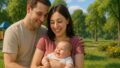 「公園の噴水の前で、身長192cmの高身長のお父さんと、身長148cmの小柄なお母さんが、3歳の長男と1歳の次男と手をつないで歩いている。次男は歩けるようになったばかりでお母さんと手をつなぎ、長男は背の高いお父さんと繋がれた手が宙に浮くような高さになっている。緑の木々と花に囲まれた明るい家族の姿。」 大きい体あるある