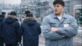 工場で作業着を支給された新卒社員の男性が、身長192cm・太もも周り62cmの体格に対して明らかに小さすぎる作業ズボンを手に持ち、驚いた表情で見つめている様子。