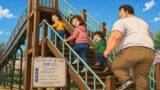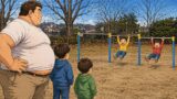 公園のターザンロープで大柄な男性がロープにしがみつくが体が重くて地面から離れられず、そのまま地面に体を引きずりながら進んでいる様子を家族が見ている