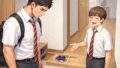 靴から足がはみ出し、下駄箱からも靴がはみ出す、
