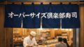 近未来的なデザインのお寿司屋さん「オババ寿司」の外観イラスト。伝統的な暖簾には「オババ寿司」と書かれ、青いネオンのような光が施されている。和風の店構えに、未来的な照明や装飾が融合した不思議で新しい寿司店の雰囲気が描かれている。 食・お店あるある